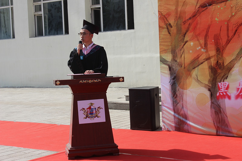 毕业生代表姚希锃讲话,他向辛勤培育自己四年的母院表达最诚挚的谢意,自己的亲身经历证明:“专业+俄语”的培养模式是可行的,中俄学子具备高竞争力;他代表毕业生们立志在未来的生活中不断超越自己。