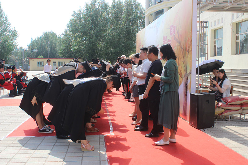 随后,毕业生代表向学院赠送手印画,全体毕业生向领导、老师赠送贺卡、鞠躬行谢师礼、放飞气球,很多老师、学生相拥在一起,留下了激动的泪水。